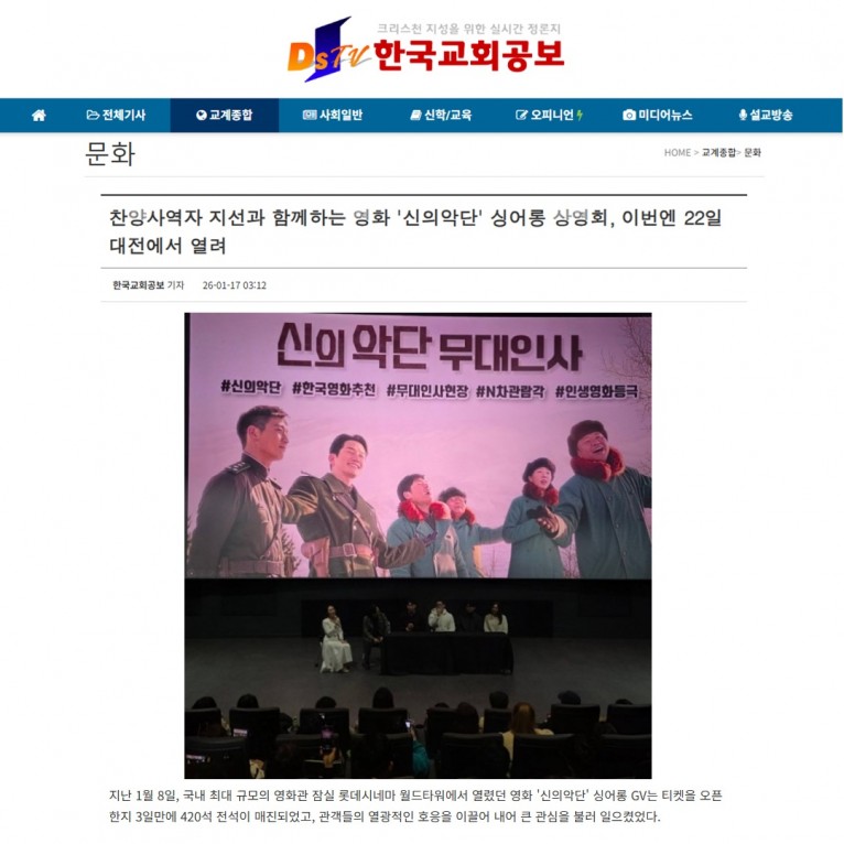 뮤직타임 [기사] 찬양사역자 지선과 함께하는 영화 '신의악단' 싱어롱 상영회, 이번엔 22일 대전에서 열려(한국교회공보)