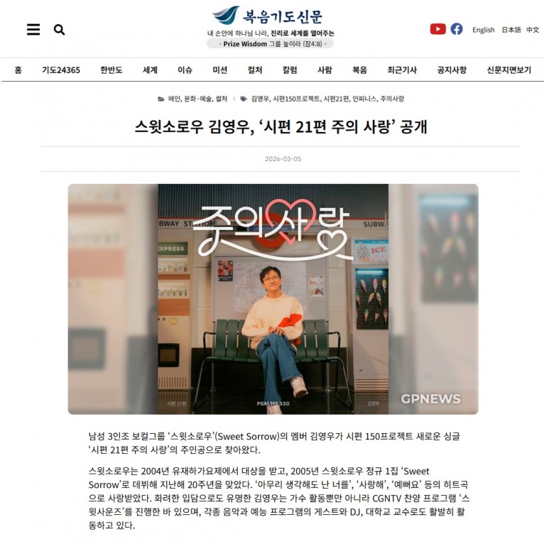 [기사] 스윗소로우 김영우, ‘시편 21편 주의 사랑’ 공개(복음기도신문)