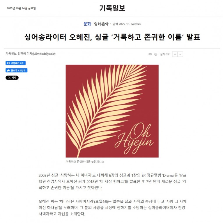 [기사] 싱어송라이터 오혜진, 싱글 ‘거룩하고 존귀한 이름‘ 발표(기독일보)